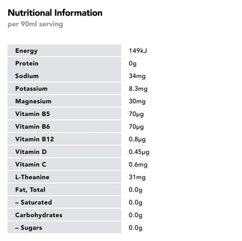 Water, Sodium Chloride, Potassium Chloride, Vitamins - D, B5, B6, B12, C, Magnesium Citrate, L-Theanine, Thaumatin (natural sweetener), Citric acid, Natural flavour, Natural colours, Glycerine.